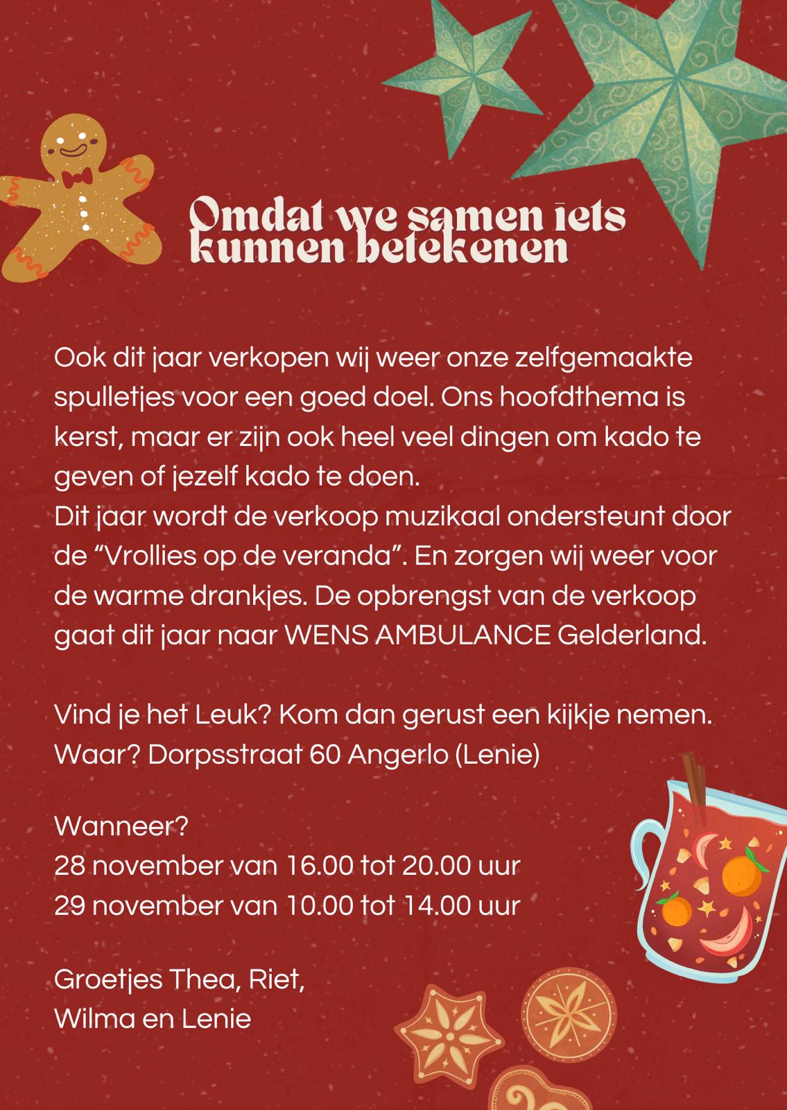 Dit jaar wordt de verkoop muzikaal ondersteunt door de “Vrollies op de veranda”. En zorgen wij weer voor de warme drankjes. De opbrengst van de verkoop gaat dit jaar naar WENS AMBULANCE Gelderland.